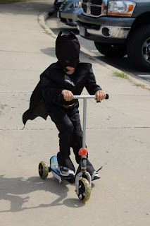 Batman, aka. Mason, speeding away on his bat mobile, aka. scooter.